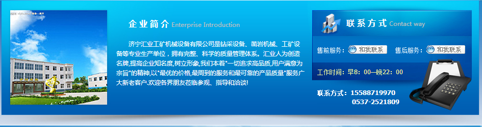 济宁汇业工矿机械有限公司位于孔孟之乡、运河之都的魅力城市济宁,东临“东方圣城”曲阜,西临历史悠久的京杭大运河,南临”“齐鲁灵秀”微山湖, 北临”五岳之尊”泰山。公司成立于2013年,注册资金101万,现有员工200余人,根据市场需要专业经营液压钻机,水井钻机,坑道钻机,岩石电钻,喷浆机,支护设备,刮板机配件,轨道器材等矿用设备及配件。公司秉承“为客户提供便利服务,为员工创造发展机会”的经营理念及“进取不懈,成功尽享”的企业精神。热忱欢迎国内外各界新老朋友前来洽谈贸易,共创大业,共铸辉煌。基本信息主营产品或服务:凿岩机械; 岩石电钻; 坑道钻机; 锚杆钻机; 泵; 潜水泵; 乳化液泵; 喷雾泵; 泥浆泵; 煤矿用传感器; 矿车; 自救器; 矿用避难硐室系统; 自救装置; 绞车; 调度绞车; 回柱绞车; 双速多用绞车; 耙斗装岩机; 轨道器材;主营行业:凿岩机械; 气动工具; 泵;& ...